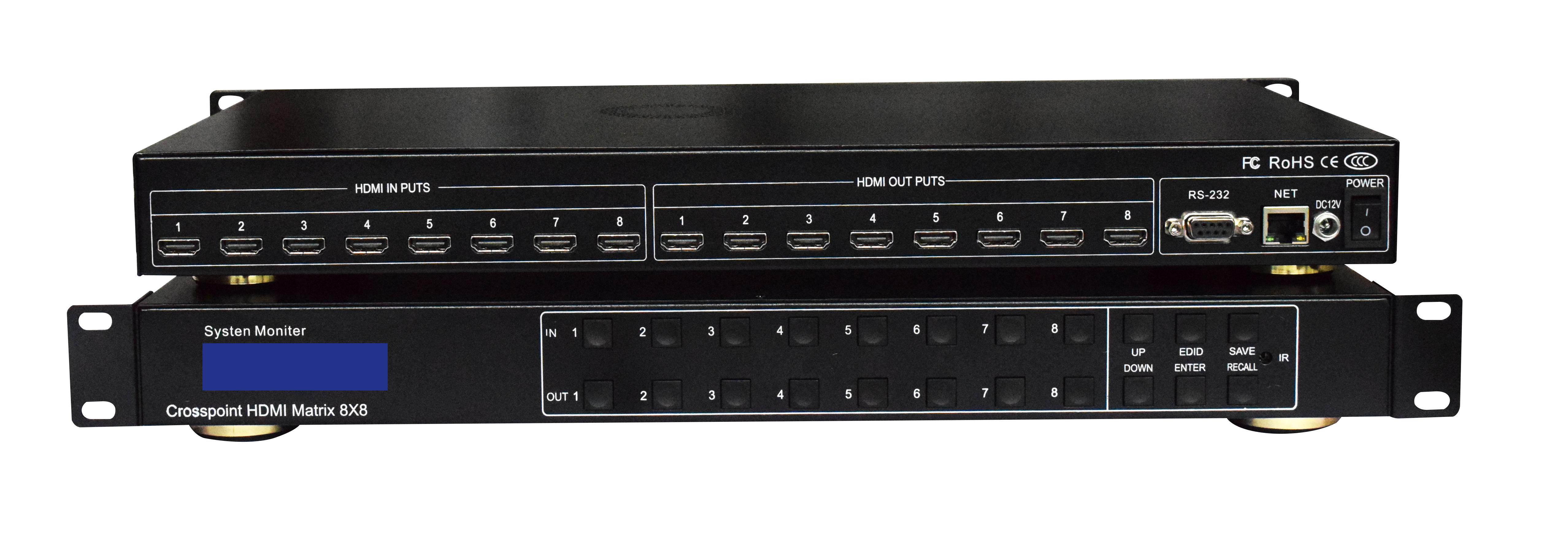 HDMI8x8矩陣(帶EDID控制)可連接8路HDMI信號源到8個顯示設備。主機有8路HDMI輸出,且每一路HDMI輸出都支持1080p到4K的全高清格式,以及所有的3D格式。支持獨立的EDID控制。HDMI8x8主機可連接到HDMI顯示器的藍光DVD、數字機頂盒、筆記本電腦搭配使用。通過提供的IR遙控裝置、RS-232和TCP/IP,或者通過前面板的選擇按鍵來選擇,切換顯示。