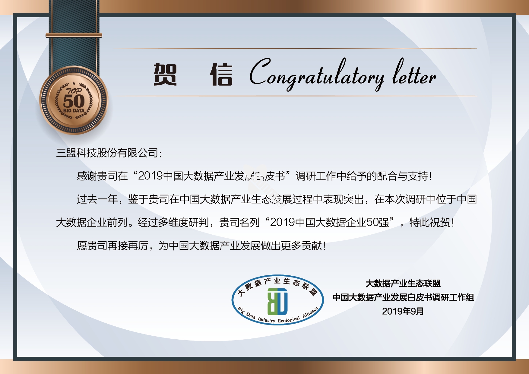 本次“2019中國大數據企業50強”評選不以企業規模為入選的核心考核指標,更加注重企業的大數據技術能力與行業應用之間的深度融合,對企業在大數據上的研發投入,大數據產品、解決方案及應用案例,大數據投融資需求及發展潛力等多個維度進行考核,覆蓋了中國大數據產業生態鏈上的各個細分環節。由知名高校、研究機構、行業用戶CIO、知名投資人、大數據企業領袖專家構成的專家委員會多輪評定,三盟科技從2000余家參選企業之中脫穎而出,與華為、騰訊、阿里、百度、小米等企業同時上榜由中國大數據產業生態聯盟組織評選的“2019中國大數據企業50強”。