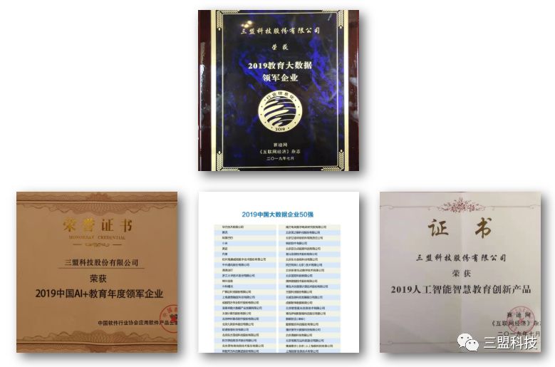 三盟科技作為“教育行業新一代信息技術高科技領軍企業”、“廣東省大數據骨干企業”,多年來一直專注人工智能、大數據、物聯網等新一代信息技術的自主研發與應用創新,高速發展的同時在各領域也碩果累累,2016-2019連續四年榮獲“中國大數據企業50強”、“教育大數據領軍企業”,2019年獲評“中國AI+教育年度領軍企業”、“人工智能智慧教育創新產品”等,種種榮譽都見證著三盟科技的成長。