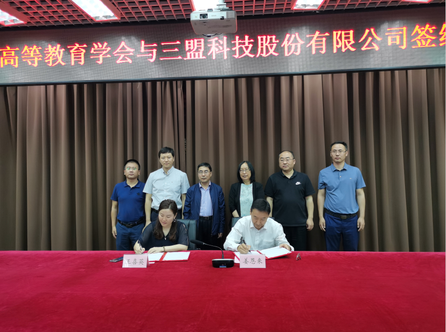 為推進產教融合,助力教育信息化發展,服務高校線上教學模式創新,5月28日,三盟科技與中國高等教育學會在北京簽訂戰略合作協議。中國高等教育學會副會長、秘書長姜恩來,副秘書長王小梅、郝清杰,學會秘書處辦公室主任王雪濤,事業發展部主任吳英策,聯絡與宣傳部高級項目主任趙鋒,三盟科技股份有限公司董事長王喜英、副總裁龔小平等出席簽約儀式。