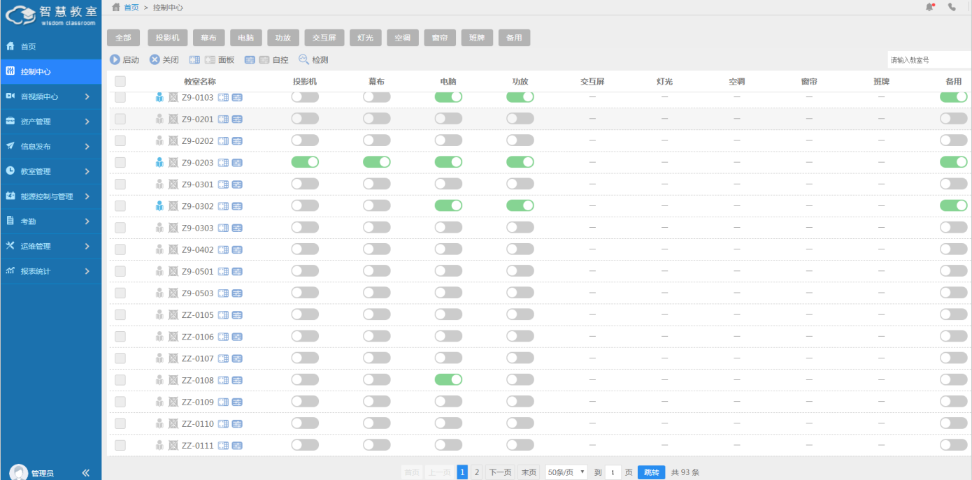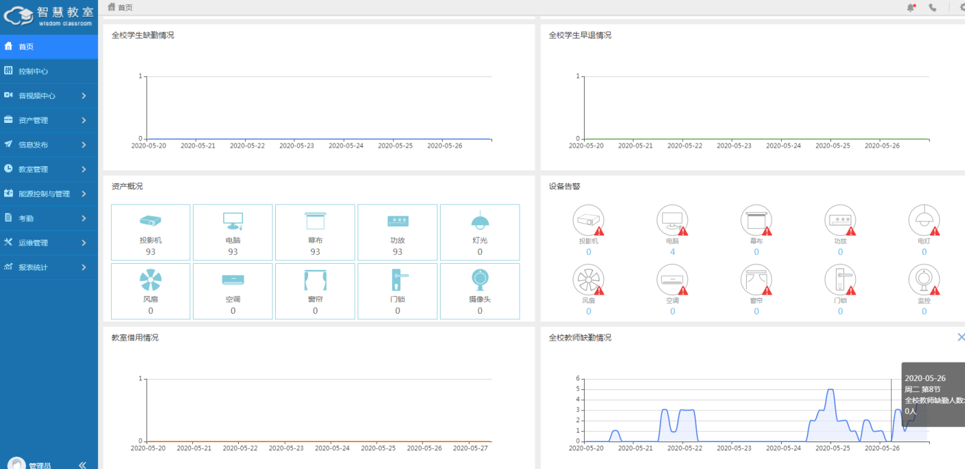 管理員無需一間間巡查,只要打開手機或電腦,就能管控教室里的每個設備。平臺還能對設備自動巡檢、報警、根據課表開關設備、遠程協助、對設備運行數據進行統計和分析。