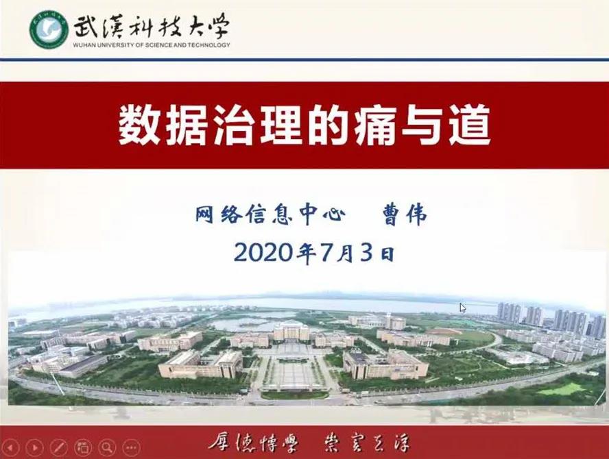 武漢科技大學網絡信息中心主任曹偉作了《數據治理的痛與道》主題分享。他介紹了前期學校在面臨數據治理中遇到的數據采集、業務孤島、數據共享等難題,并就如何開展數據治理工作提出了參考思路,即通過整理數據、建設應用、優化流程、開放服務四個維度開展,實現為全校師生及職能部門提供開放可利用的校園數據服務。