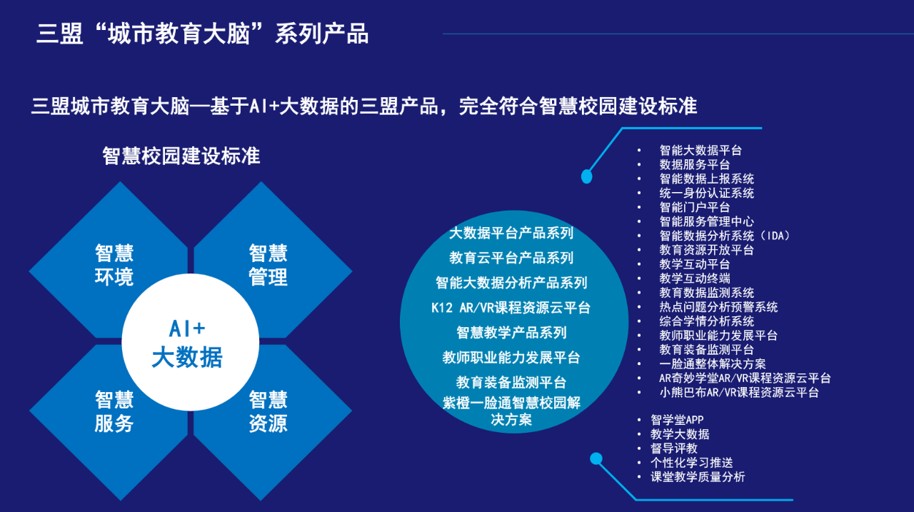近年發布的《教育信息化2.0行動計劃》、《中國教育現代化2035》及各地區智慧校園建設標準均明確提出,智慧校園建設需覆蓋全體學校,基礎環境完善是建設基礎保障,要建設智能化校園,統籌建設一體化智能化教學、管理與服務平臺。而《智慧校園總體框架》國標正是規范了智慧校園建設的一把準尺,城市教育大腦也正是基于這一大背景研發的智慧教育整體方案。