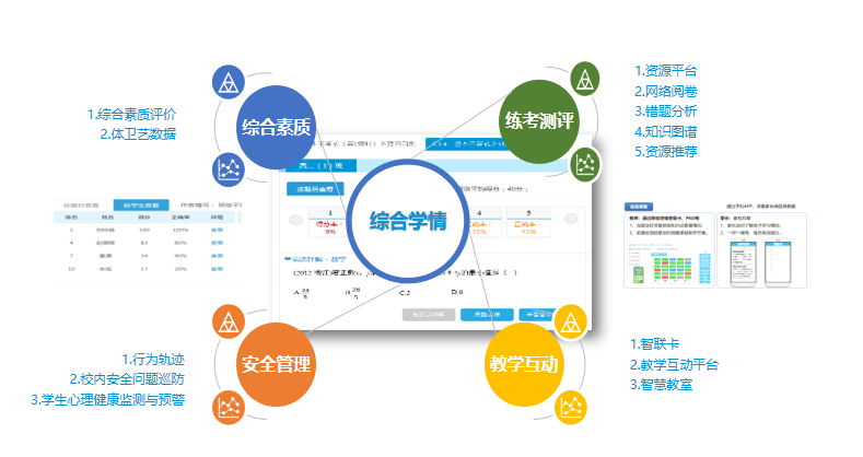 城市教育大腦擁有八大產(chǎn)品線十八大產(chǎn)品,全方位滿足普教信息化的需求。其中,智慧教學(xué)產(chǎn)品聚焦于智慧教育中的N個(gè)應(yīng)用場景,解決學(xué)情難掌握、學(xué)業(yè)負(fù)擔(dān)重、教學(xué)管理缺乏數(shù)據(jù)支撐、家校溝通不便捷等切實(shí)痛點(diǎn),推動教學(xué)資源均衡化、精準(zhǔn)教育落地化、智慧教學(xué)個(gè)性化、綜合評價(jià)體系化、學(xué)生安全管理化。