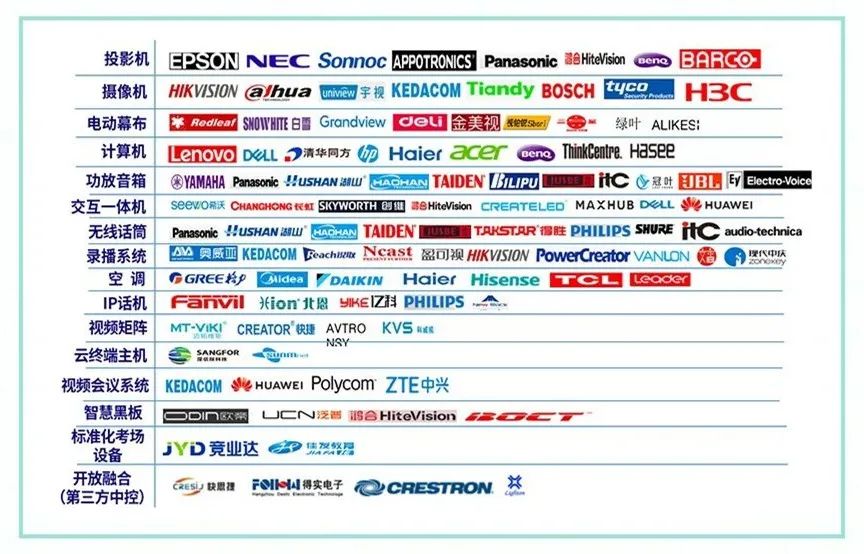 智校平臺支持自定義控制設備接口,擁有同類平臺難以企及的兼容性,既能接管第三方設備及平臺,還能實現數據的互通有無。其兼容性在市場表現上尤為亮眼,已兼容產品共15大類、102個品牌、1020余種設備。