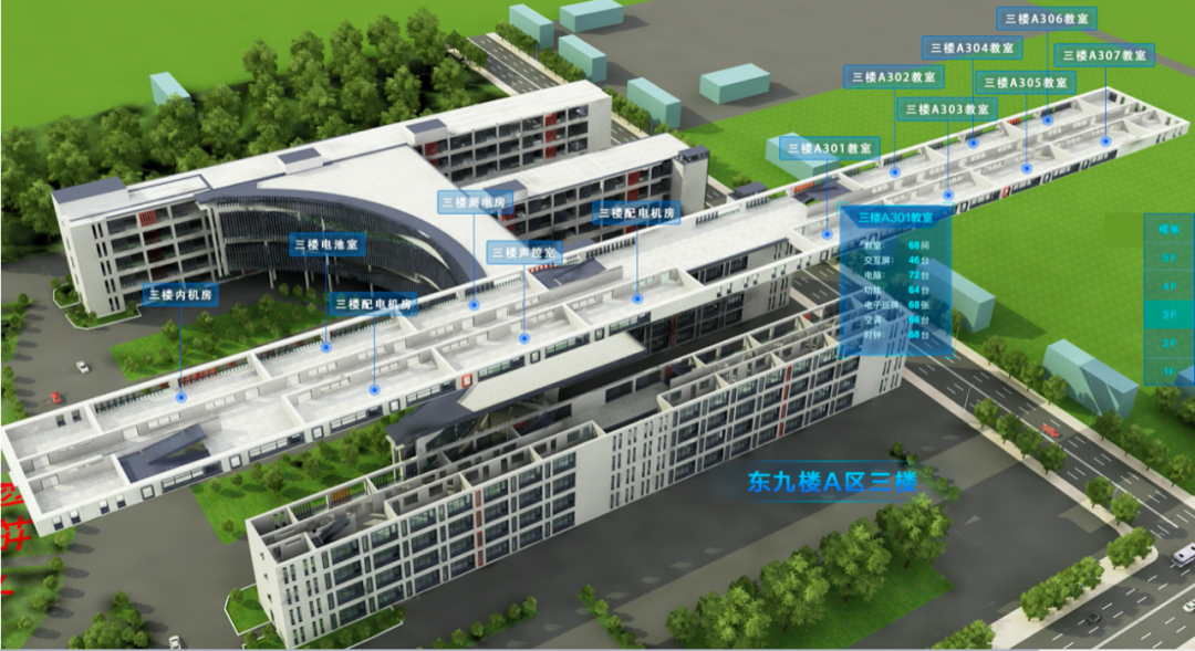 如何讓大體量的教室管理工作變簡單,三盟科技一直在積極探索。在智校平臺率先采用數字孿生技術,對學校園區、教室進行3D建模,借助平臺就能清晰看見各區域設備的運作情況,如同親臨現場管理,讓管理質量及效率有了跨越性提升。