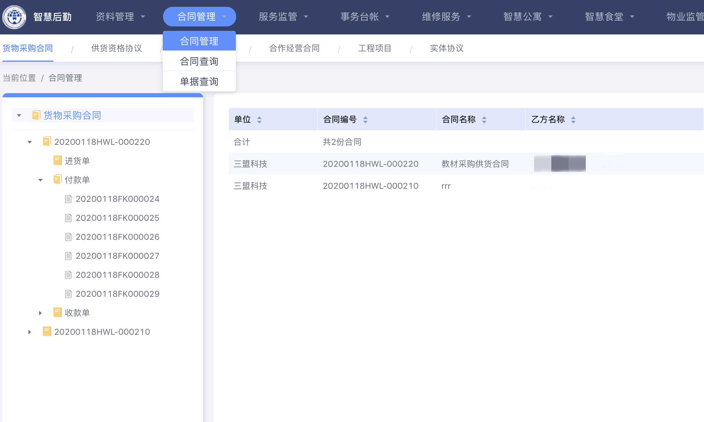在后勤管理中,合同管理是極易出現(xiàn)疏漏的環(huán)節(jié)。合同量大,一旦出現(xiàn)審批不及時,容易造成招標延誤,服務(wù)斷檔等問題。合同管理平臺通過將各類合同及單據(jù)進行線上審批,并設(shè)置提醒機制保證審批工作快速完成,有效促進合作、付款及收貨工作的高效達成。能耗監(jiān)控平臺包含商戶繳費、師生繳費、空調(diào)申請、電話申請等模塊。該平臺解決了能源監(jiān)管的盲區(qū),通過統(tǒng)一監(jiān)管,為學(xué)校節(jié)約能源,節(jié)省成本。值得關(guān)注的是,后勤工作除了硬件及應(yīng)用性建設(shè)之外,對留存數(shù)據(jù)的挖掘和再利用也是重中之重。三盟通過建立大數(shù)據(jù)平臺,幫助廣外留存有價值的數(shù)據(jù)并進行更深層分析,有效提升解決學(xué)校跨系統(tǒng)的數(shù)據(jù)分析及預(yù)測能力。此外,智慧后勤平臺還提供了移動端入口。管理員除了可在網(wǎng)頁端開展后勤管理工作外,還可通過手機APP進行遠程管理,保障后勤服務(wù)的及時性。同時,也相當(dāng)于為全校師生提供了“移動后勤辦事大廳”,通過手機APP就能享受預(yù)約、申請、投訴、維修、繳費等多種后勤服務(wù)。