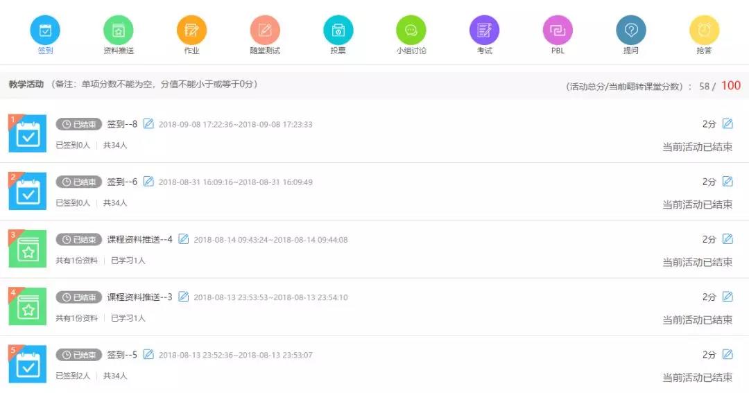 活動類型:簽到、資料推送、作業、隨堂測試、投票、小組討 論、考試、PBL、搶答、隨機選人、頭腦風暴