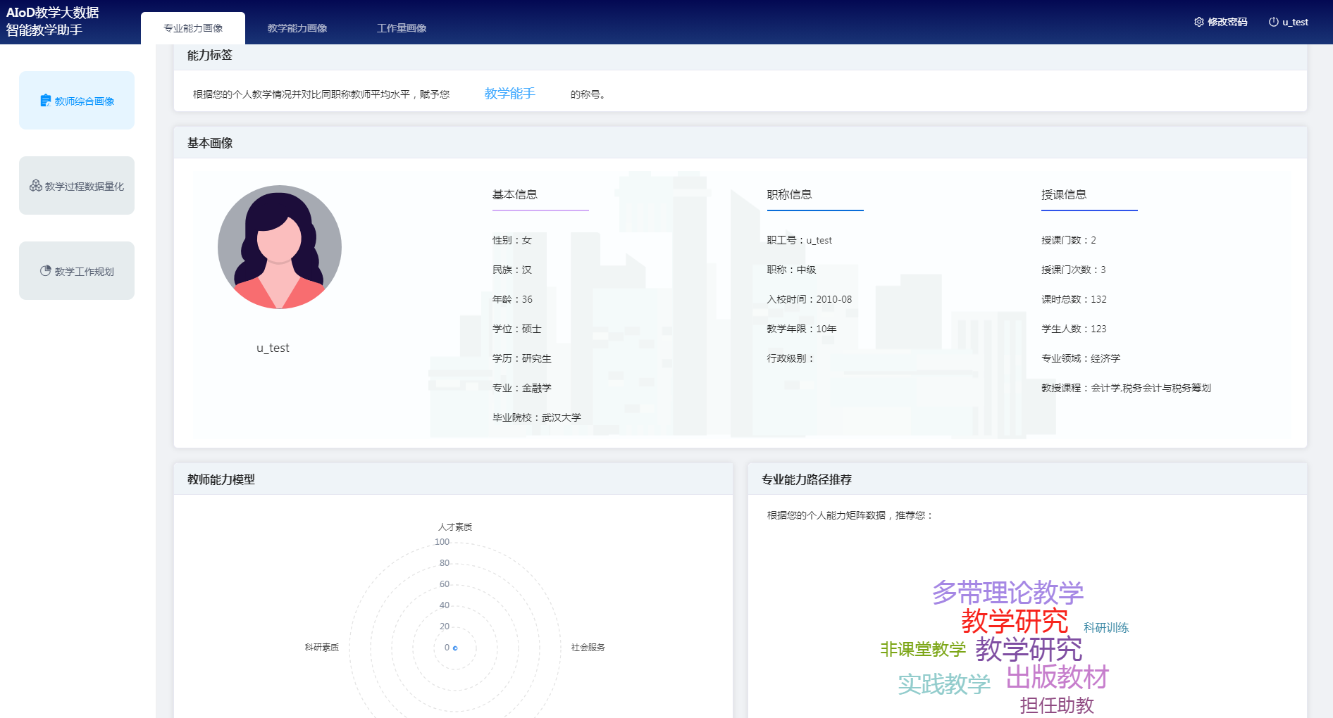 平臺通過綜合分析教師教學過程、教學內容、教學行為、教學成果、教學評價等數據,構建教師綜合畫像,并根據教師的個人能力矩陣,推薦專業能力發展路徑,促進教師自我能力提升。
