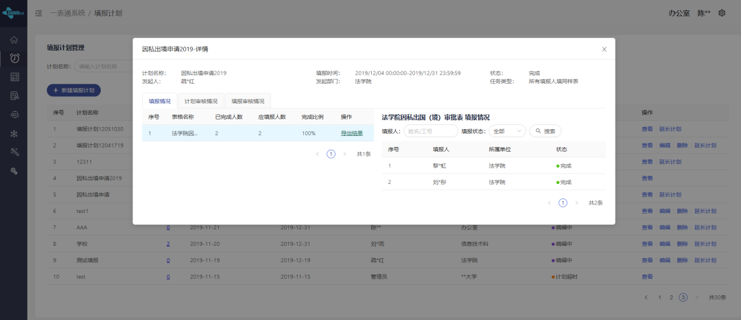 行政老師通過在系統上發起提報計劃,并設定起始時間,選擇需要填報的表單和需要填報的人員,并制定該填報任務的工作流程和審核流程,即完成一個填報計劃的制定。
