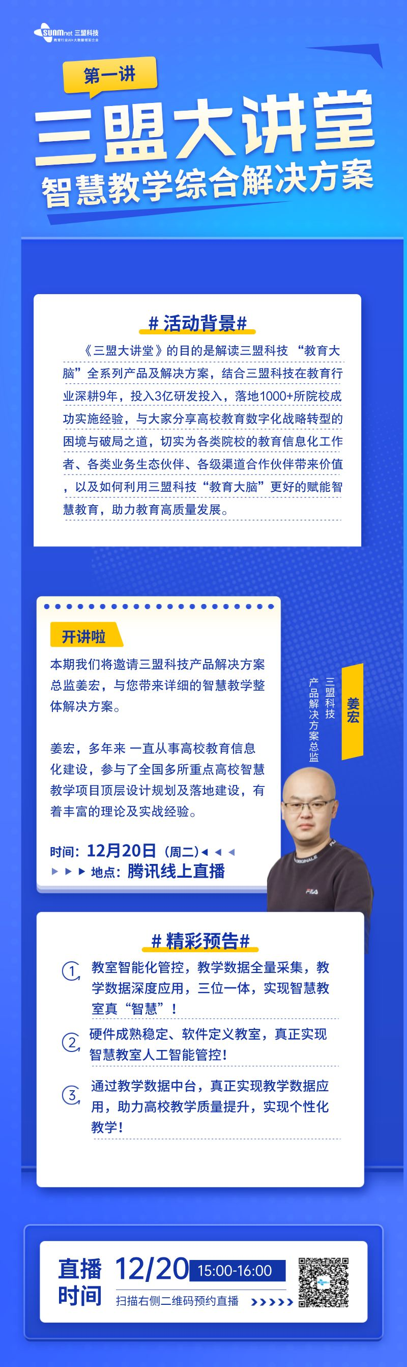 三盟科技傾情打造《三盟大講堂》,助力各類院校與各類合作伙伴在教育數字化轉型的目標、方法、實施等方面達成共識,并給予實戰技巧。首期節目特邀三盟科技產品解決方案總監姜宏線上開講,歡迎各類院校老師、合作伙伴朋友們走進直播間共同學習,為教育數字化戰略轉型助力。
