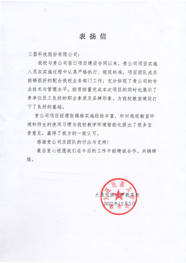 2022年8月,三盟科技與河南紅颯科技發展有限公司就河南職業技術學院現代技術綜合實訓中心智慧教室建設項目簽訂合作合同,期間三盟科技項目實施團隊,憑借認真、敬業、技術水平過硬、工作責任心強,對項目實施過程中存在的問題發現及時、處理得當,獲得校方和合作伙伴同事的高度認可。