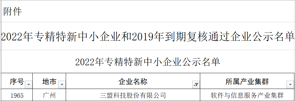 近日,廣東省工業和信息化廳公布了2022年專精特新中小企業名單公示,三盟科技股份有限公司(簡稱:三盟科技)被認定為廣東省專精特新中小企業。