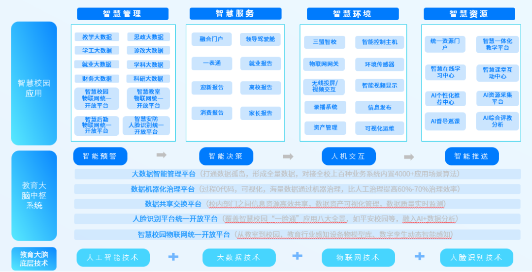 三盟科技作為教育行業AI+大數據領軍企業,積極利用AI+大數據技術,通過建設一個統一的大數據底座,整合所有的應用,最終形成數據的合力,實現創新的、智能化的智慧校園應用,深度賦能高校教育數字化的整體建設。