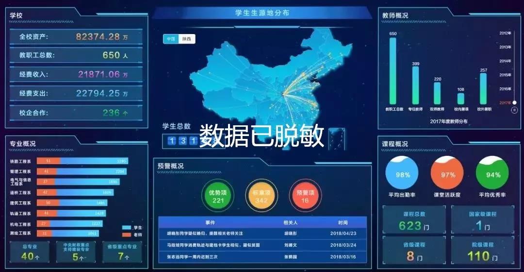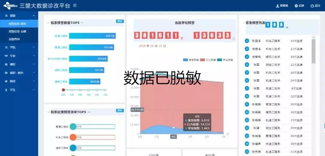 以院校指標體系為依據、以校本數據為基礎,設計五橫畫像系統,包含學校、專業、課程、師資、學生維度的畫像展示。并且具有單獨的預警模塊,實時、動態的掌握全校發展,為及時糾偏提供大數據的支持。