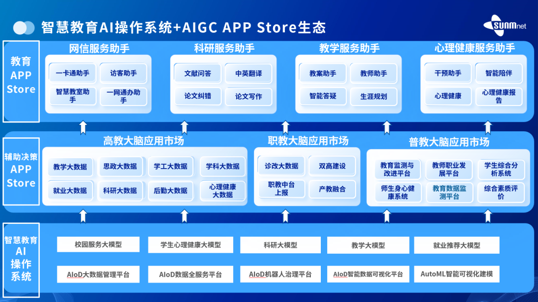 三盟科技基于自主研發的教育垂類大模型——智慧教育AIGC大模型操作系統為底座,打造智慧教育AIGC App Store,構建教育全場景AIGC服務助手廣場。三盟科技AIGC服務助手廣場提供涵蓋辦公、科研、教學、學習、招生、生活、情感、就業等類型的智能助手,為高等教育、基礎教育提供全方位的AI服務,高效響應學校管理者、教師、學生、家長的多樣化需求。