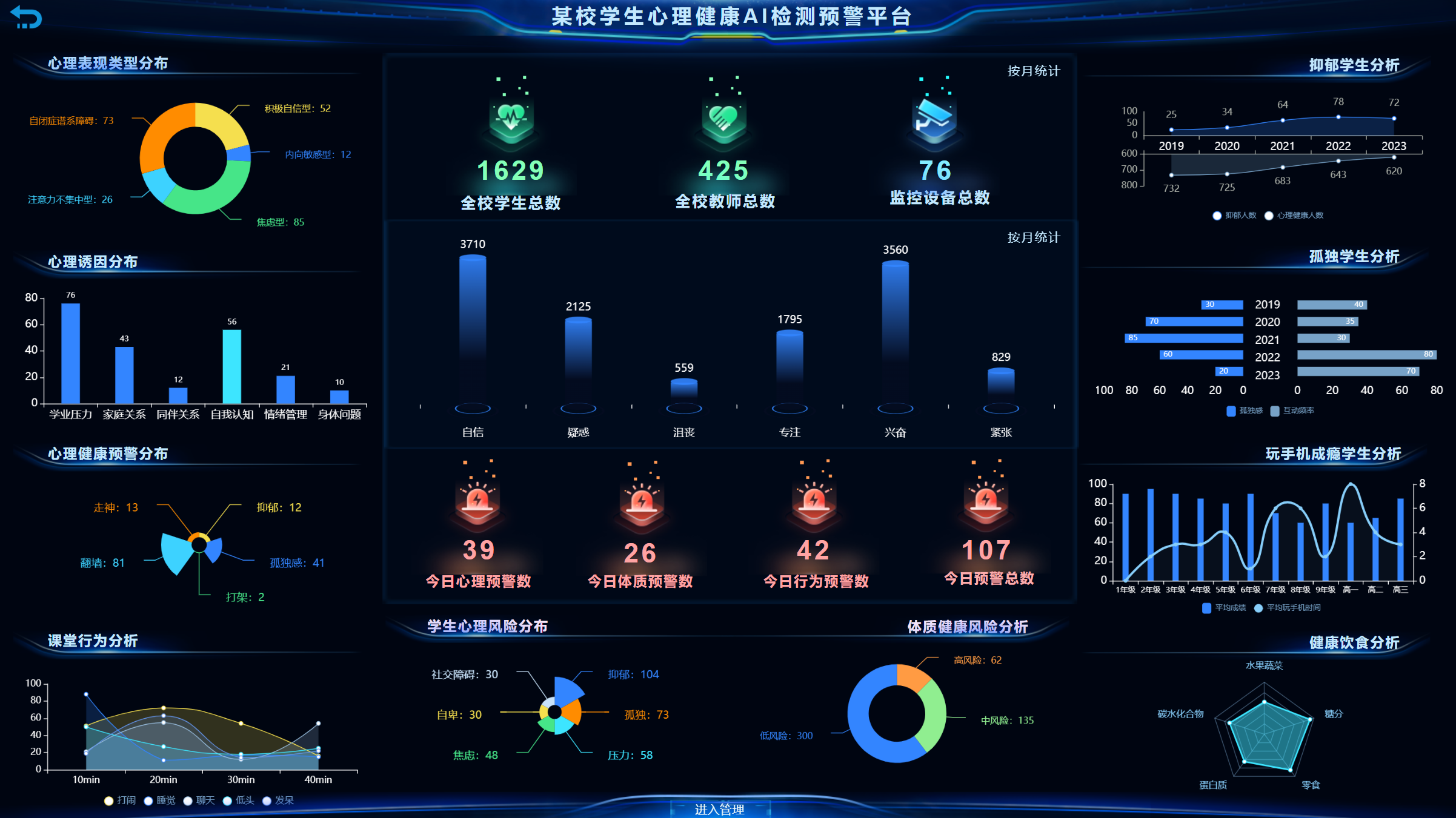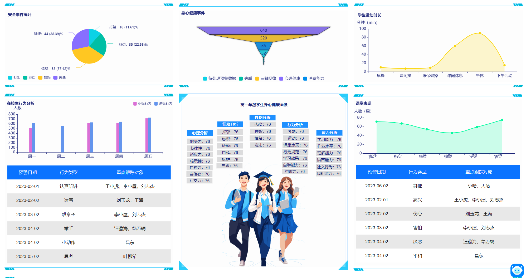 平臺提供全周期的學生身心健康智能監測體系,對異常行為或風險事件進行事前預警,包括學生社交關系、學習異常、消費異常、營養異常、情感異常、心理健康、疑似逃課等方面的預警,有利于學校前置干預和解除學生心理危機。