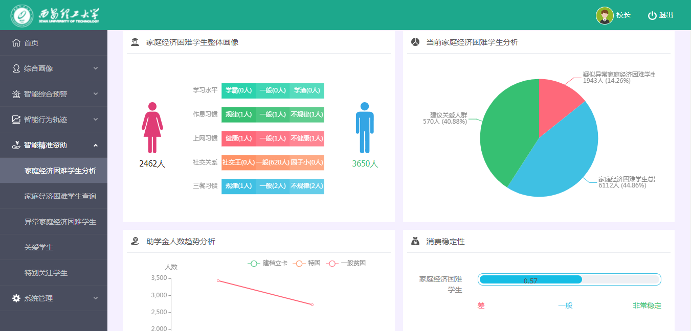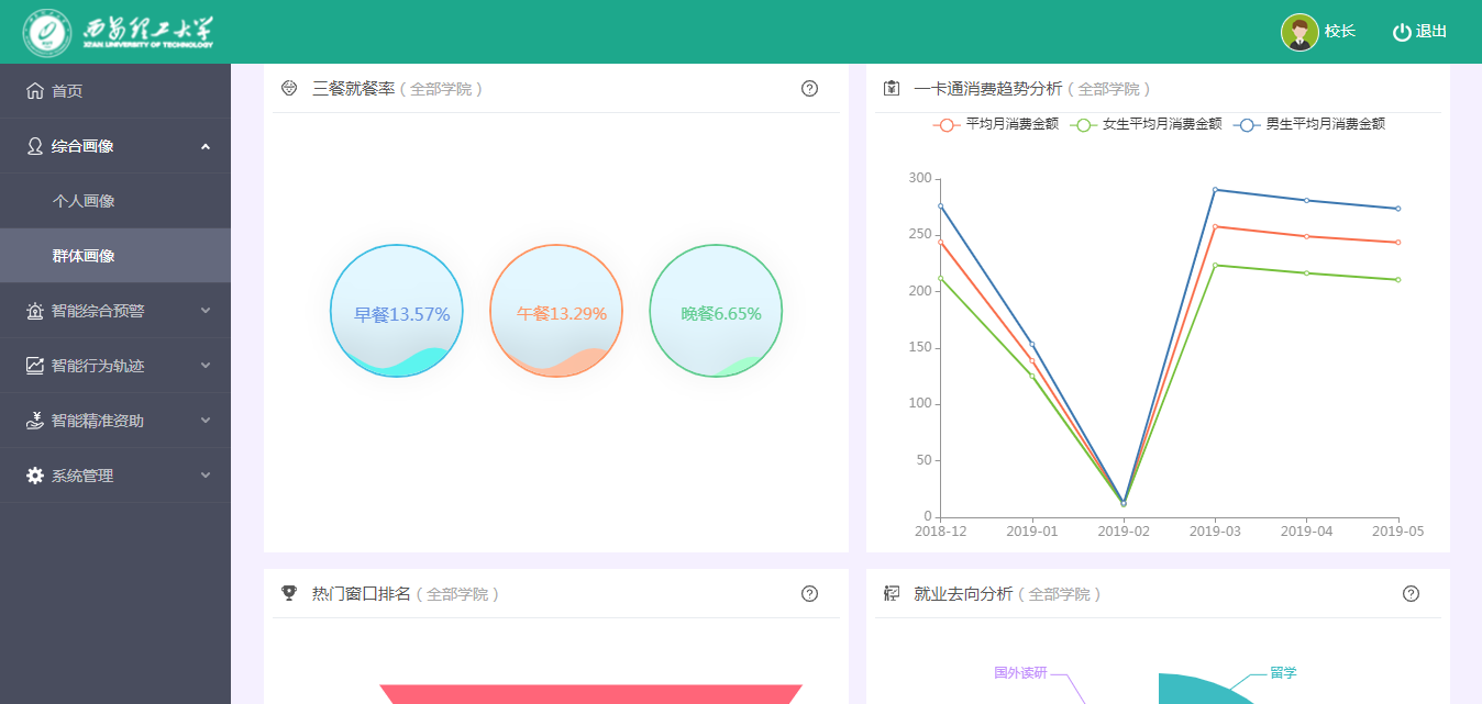 三盟科技學工大數據分析系統有綜合畫像、綜合預警、行為軌跡、精準就業分析、系統管理、思政分析、心理健康分析、精準資助認定八個主要功能模塊。這些功能模塊包括但不限于學工、心理、團委、宿管、離校、就業及其它功能,是學生管理工作的有效輔助工具,對建立良好學風、維護穩定校園秩序、提升管理服務水平都有著重要作用。