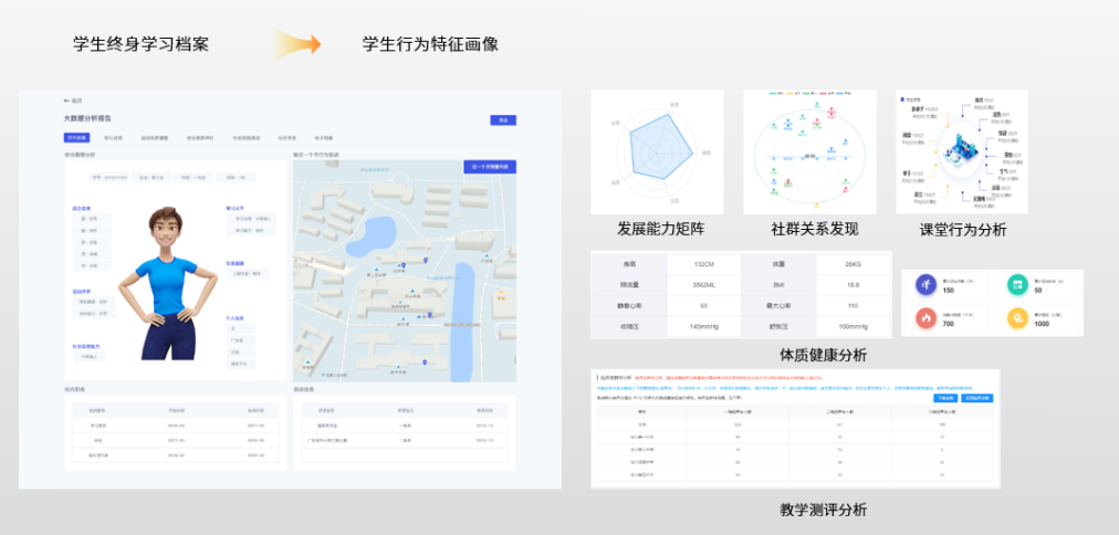 提升學校教學質量的整體目標需落實在每一位學生的身上,保證教學過程高效開展是促進學校教學質量提升的有力途徑。通過融合“教、學、練、評、測”教學各流程數據和“課中、課外、家校共育”等環節數據,可生成圍繞“學業、德育、思政、身心健康”的個性化學生畫像,發現學生特長,實現規模化教學與個性化學習的有機融合,輔助實現智能、精準、高質量教學。